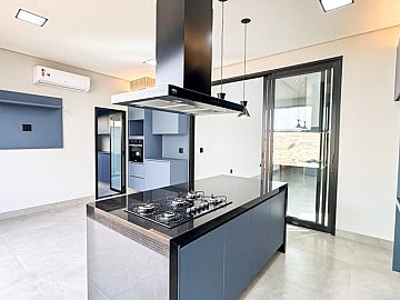 Cozinha planejada com ilha e área gourmet integrada