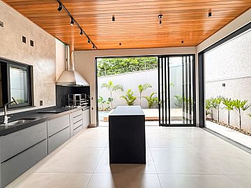 Área gourmet com ilha e teto de madeira