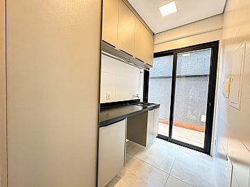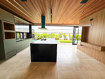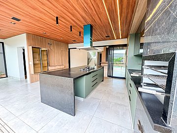 Cozinha planejada com ilha e área gourmet integrada