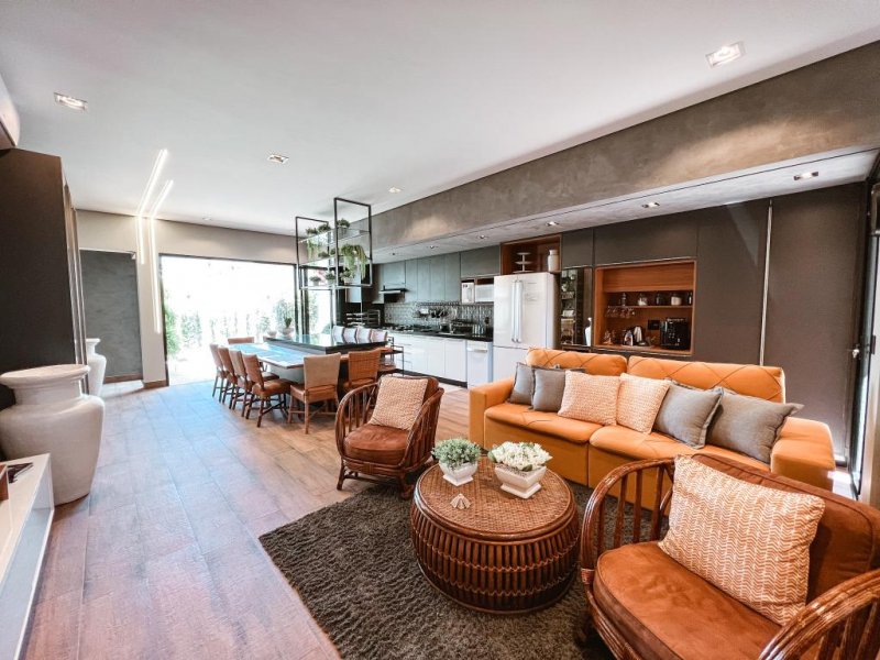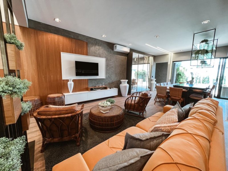 Sala de estar, sala de Tv e Sala de Jantar com pé direito alto integrada com a cozinha e área gourmet em um lindo projeto arquitetônico