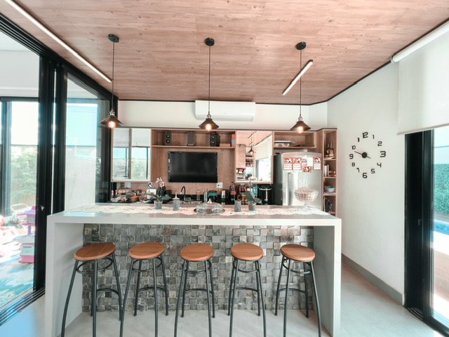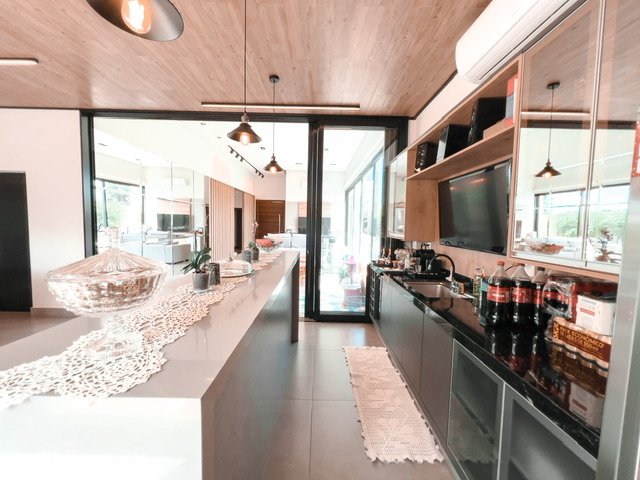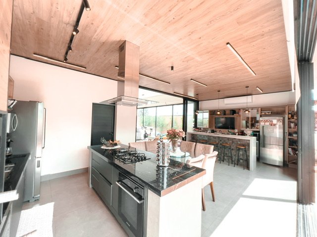Cozinha planejada e integrada área gourmet com churrasqueira e ilha
